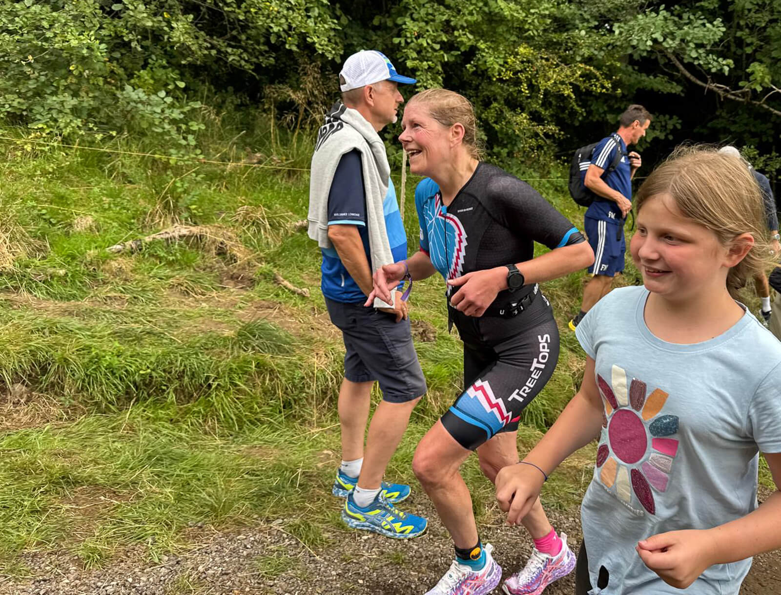 Auf dem Rückweg zum See steigt die Spannung auf das Highlight der Laufstrecke, den Kuhsteig! Der knackige Trail bei Kilometer 15 fordert noch einmal Kraft und Technik auf matschigen Boden, die Zuschauer geben ebenfalls alles und die Allgäu-Kombo mit Akkordeon ist schon von weitem zu hören. Aber noch viel lauter sind meine persönlichen Fans und auf halber Strecke werde ich ein Stück begleitet, Christian und mein Patenkind Cora legen einen kleinen Bergintervall hin, um mich noch einmal für die letzten Kilometer zu motivieren.